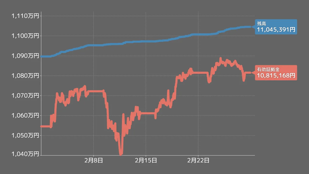 KINUGASAで運用しているFXの口座の2026年2月の収益は148,599円で、月末時点での残高は11,045,391円でした。
